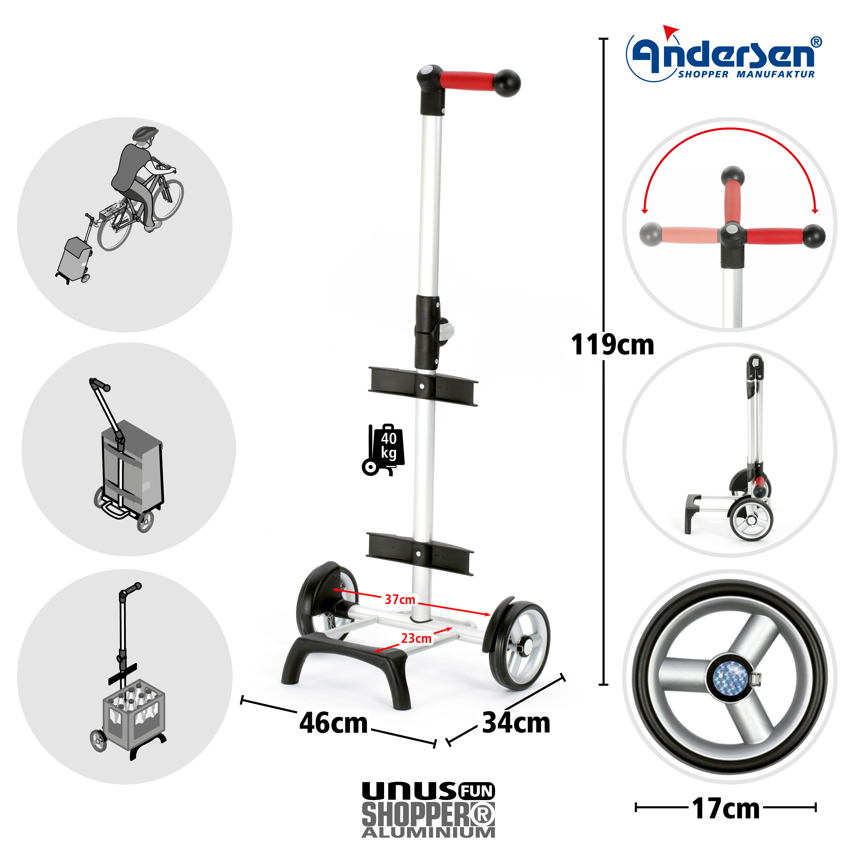 Der Unus Shopper Fun - modisches, agiles und leichtes Fahrgestell aus hochwertigem Aluminium für Ihren Komfort unterwegs! Mit dem ergonomischen und flexibel abklappbaren 3-Wege-System Griff navigieren Sie mühelos durch jede Situation. Mit einer Tragkraft von 40 kg bietet unser Fahrgestell die Stabilität, die Sie benötigen. Die leicht laufenden Flüsterräder mit 17 cm Durchmesser machen jede Fahrt zu einem Erlebnis. Mit passendem Zubehör auch als Fahradanhänger geeignet.